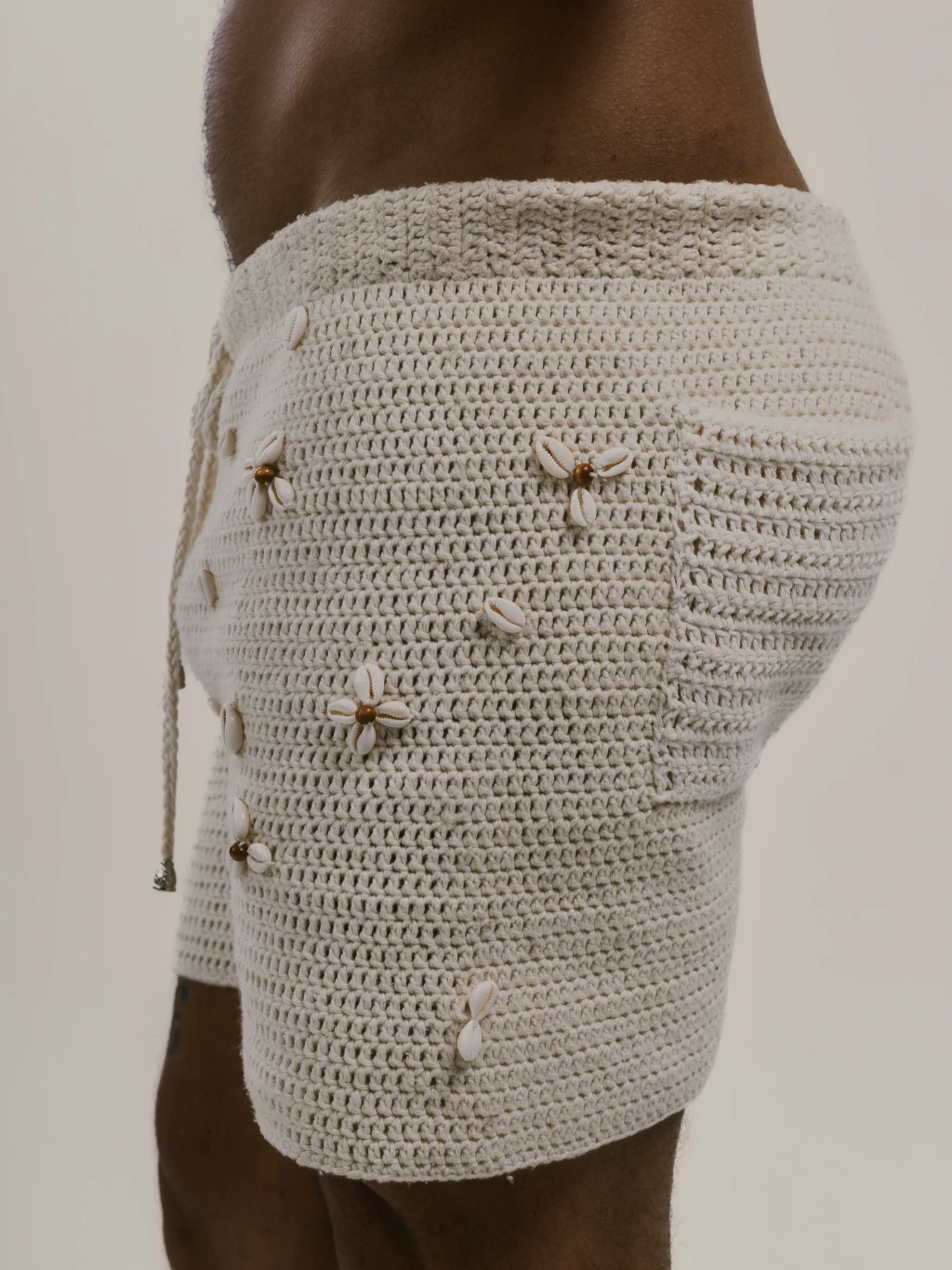 Short confeccionado em algodão, com bolso cargo em técnica tapestry e aplicações de búzios por toda a peça. Um visual marcante e cheio de referências ao mar.